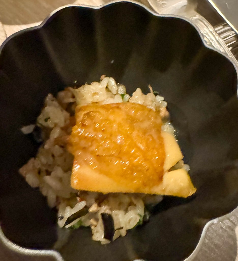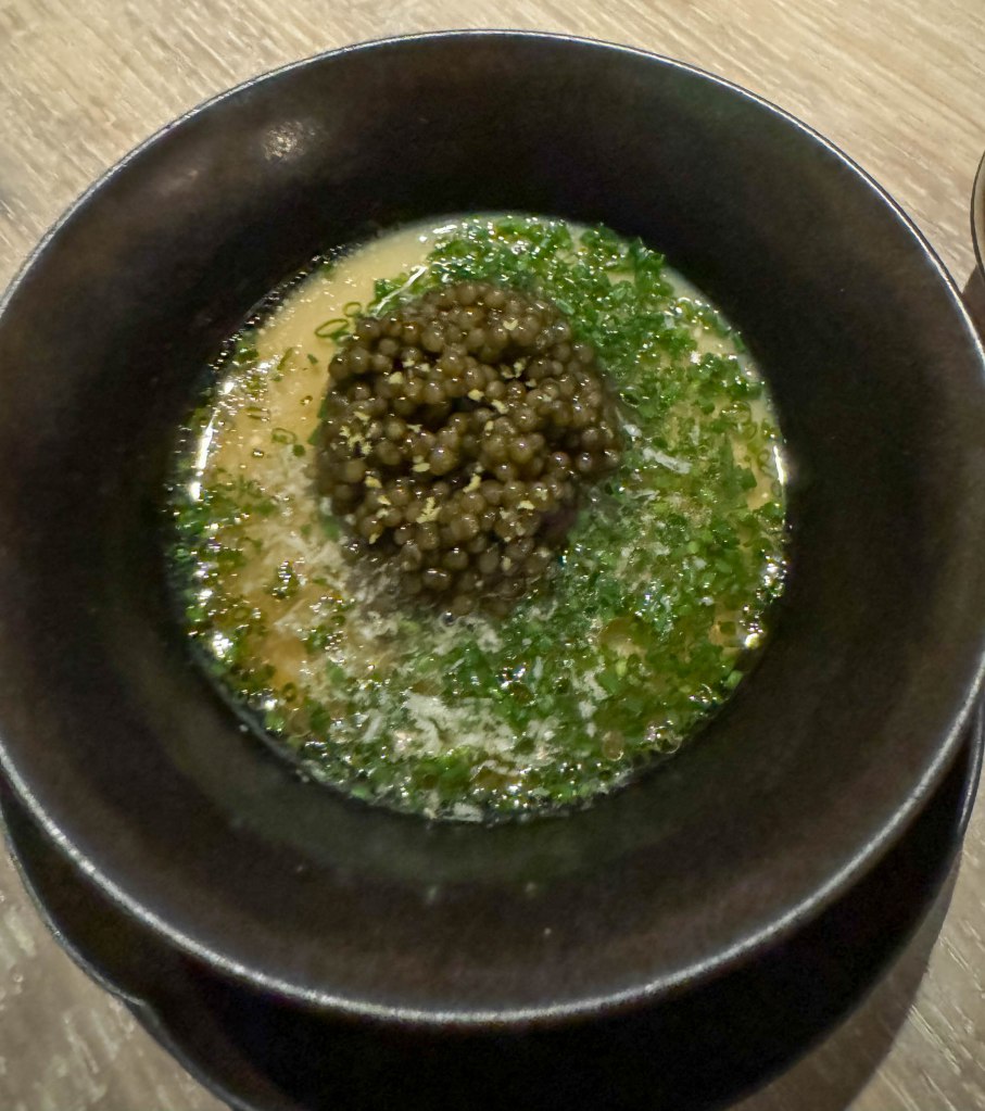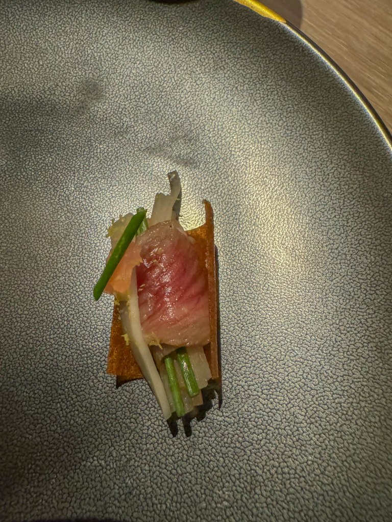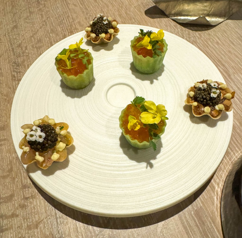 We were served a selection of 4 amuse bouches. The first amuse-bouche was a Japanese A5 wagyu beef, sake leek, enoki mushroom, and potato chip “roll”. The leak surrounding the filling was crunchy and fresh. The freshness of the leak and mushrooms contrasted with the rich buttery flavor of the wagyu beef. The potato added a nice bit of subtle starchiness to balance out the bite. Overall this was one of the best amuse bouches I ever had, and was a perfect balance of many amazing flavors and ingredients. The second amuse-bouche was a aori ika blue squid, and garden rice ball with finger limes. The squid had a very unique presentation and looked like it was going to be spikey when I bit into it. Instead, the squid was soft and tender and was balanced with the perfect amount of rice. The third amuse-bouche was a pear and miso cured salmon roe with cucumber in a tiny green pastry shell. The salmon roe was decadent and savory and was surprisingly not overly salty like most roe. The miso added its delicious umami flavor and combined with the flaky pastry shell, made for a perfect bite. The final amuse-bouche was Kaluga caviar and yuzu and black pepper inside of a shima aji tart. Like the salmon roe, the Kaluga caviar wasn’t overly salty and instead took on a lot of the yuzu and black pepper flavor, which I enjoyed. The yuzu added a citrusy flavor, while the pepper added an earthy undertone, which combined perfectly with the fish-like flavor of the caviar.