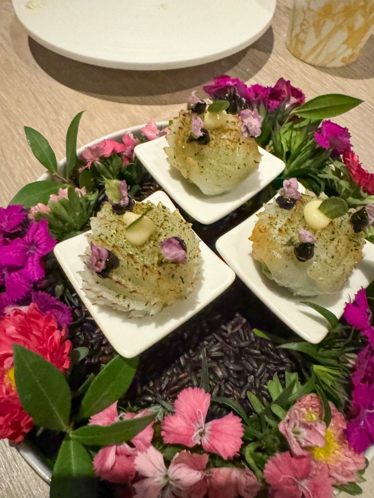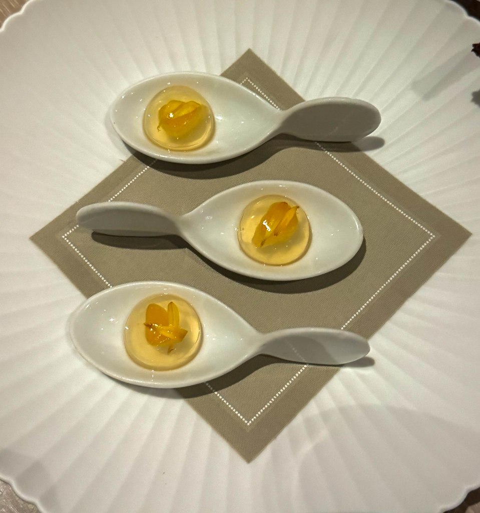 Once we were seated, we were given the set 10-course menu and the option to also add a mocktail pairing. This was the first time I had ever seen a mocktail pairing at any restaurant, so I decided to give it a try. Soon after being seated, the amuse-bouche arrived at the table.