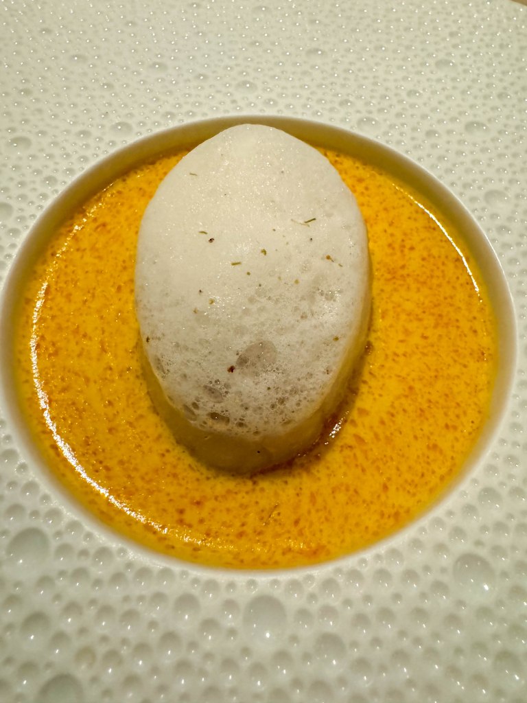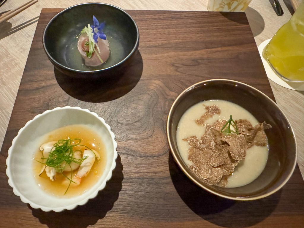 The first course consisted of three small bowls. The first bowl was a rosemary-scented sunchoke soup with abla white truffles. The sunchoke soup had a nice earthy flavor which was exemplified by the addition of rosemary. The white truffles added a rich and delicate flavor, as well as an additional hit of earthiness. The second bowl was Hokkaido snow crab and sweet shrimp dumplings with a mushroom broth. The snow crab had a super delicate and ocean-like flavor, while the shrimp dumplings had a more dominant sweet flavor, which I liked. The sweet flavor balanced out the salty ocean flavor of the crab and made for a great combination. The mushroom broth gave both the crab and shrimp an umami flavor, which was super delicious. The final bowl was cured itoyori fish with green apple and radish. The itoyori fish was super fresh and not too salty, which allowed its subtle flavors to shine. The green apple and radish were also super fresh and contrasted the meatiness of the fish very well. This course was served with a mocktail pairing which was a cucumber, orange, and yuzu drink. The citrusy flavors were tangy and fresh, which paired amazingly with all three of the bowls. You could tell that there was lots of thought put into the pairing in order to help elevate the flavors of the bowls. Overall this was an amazing first course with so many different flavors and ingredients that worked perfectly together.
