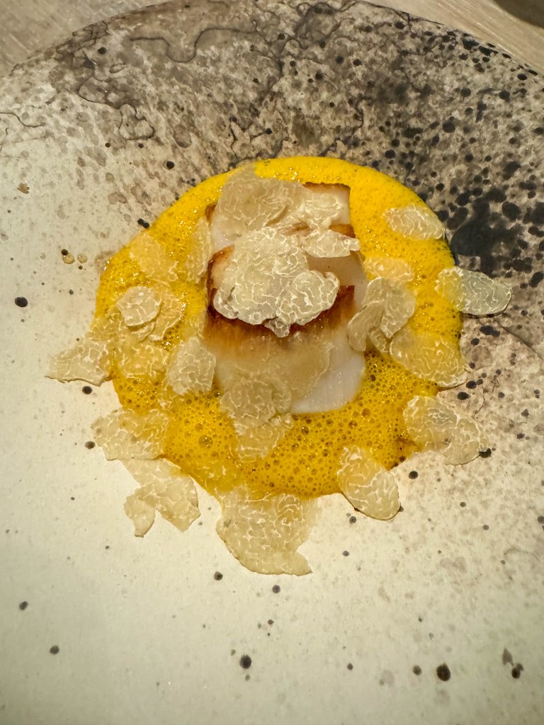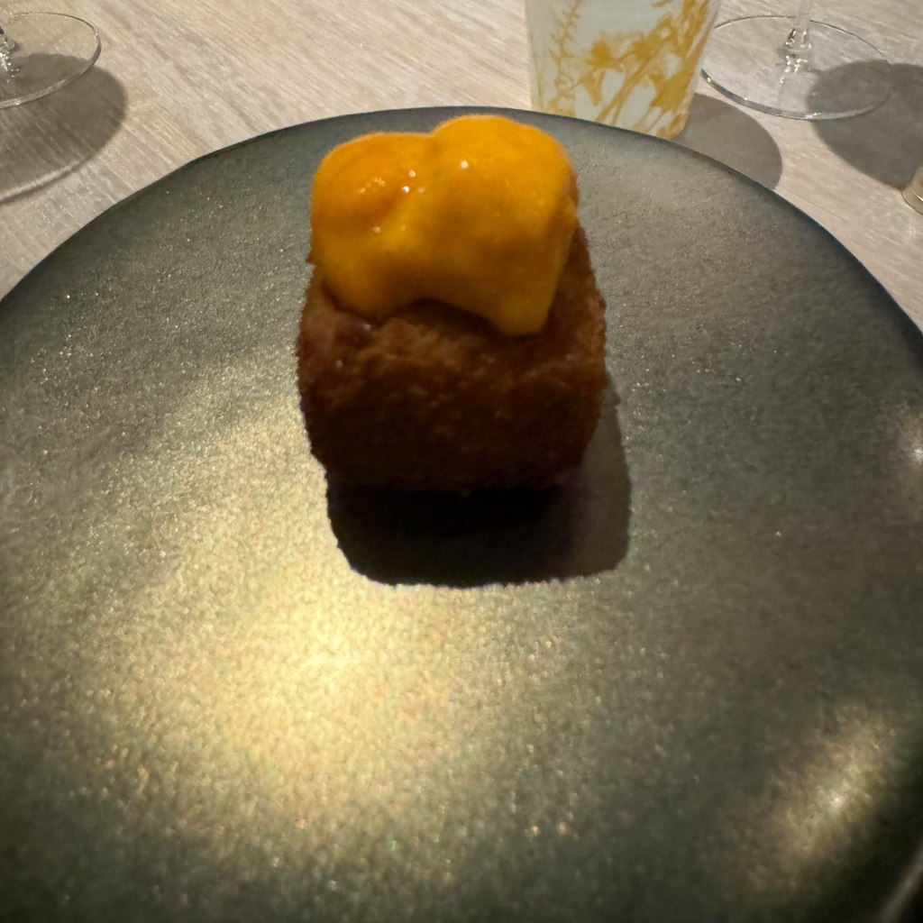The second course was a sea urchin croquette with fermented yuzu honey. The sea urchin was encased in a fried outer layer which was crispy and crunchy. The sea urchin inside was soft and smooth, creating a nice contrast of textures. The yuzu honey on top was citrusy and sweet, which paired well with the savoriness of the sea urchin croquette. Overall, this was a delicious bite that incorporated so many different flavors and textures, and they all worked perfectly together.