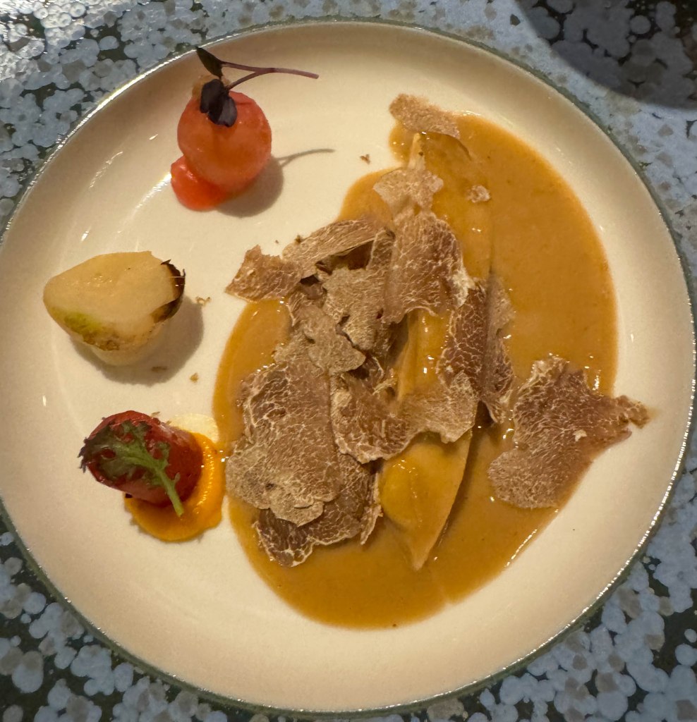 The fourth course was wild Maine scallops with a butternut squash nage (sauce) and alba white truffles. The scallop was cooked to perfection, with the perfect amount of bite and chewiness. The flavor of the scallop was mild with slight hints of fish and seaweed-like flavor. The butternut squash sauce was frothy and sweet and gave the scallops some extra flavor. The white truffles were super decadent and had a delicate umami flavor that elevated the dish to the next level. This course was served with golden beet, dates, and verjus (unripened grape juice) mocktail. The golden beets provided a slightly earthy taste, while the dates and verjus were sweet, and paired well with the butternut squash nage. Overall this was one of the best scallop dishes I have ever had, and one of my favorite courses from Mélisse.
