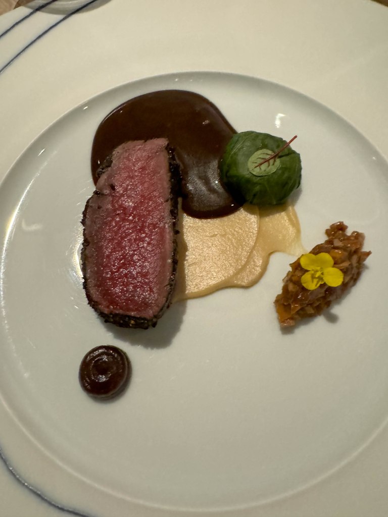 The seventh course was coffee-rubbed venison with Swiss chard and parsnips. The coffee rub was bitter and had notes of chocolate and smokiness. The venison was tender and took on some the the earthy taste of the coffee rub. The Swiss chard and parsnips on the side made for a refreshing bite in between the powerful coffee flavor. This course was served with a non-alcoholic version of Bailey’s Irish cream coffee. The coffee flavors from the mocktail and the dish were perfectly balanced so that they were both equally powerful and you could taste their unique tastes separately. At the same time, the theme of coffee flavors made this course feel very cohesive. Overall this was a very unique dish, incorporating two very different ingredients, venison and coffee, into one course.