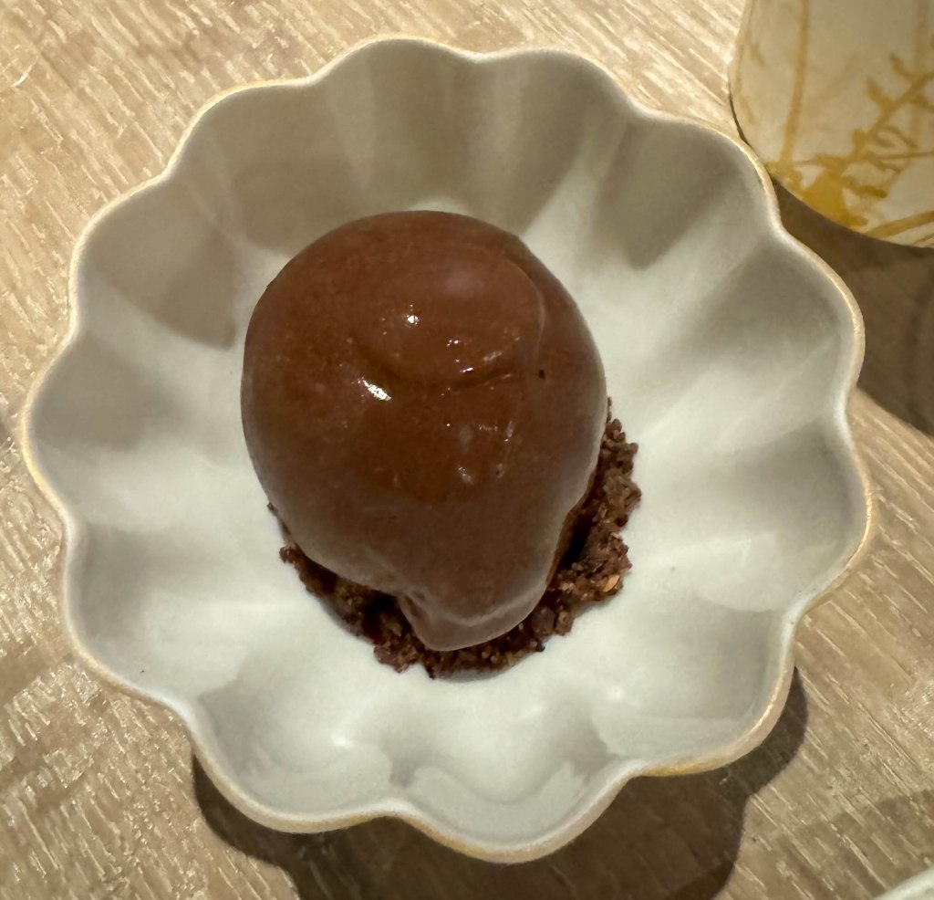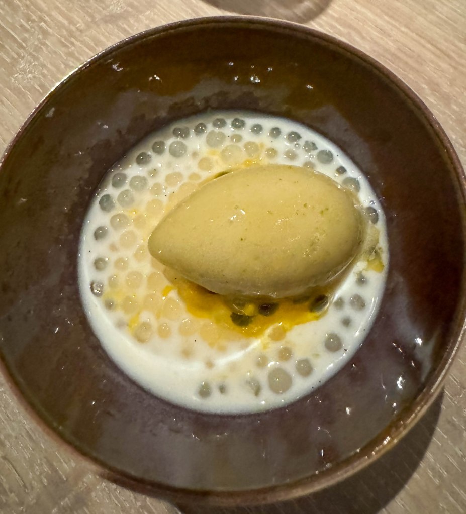 The ninth course was a pineapple and guava sorbet, passion fruit parfait, coconut, and tapioca. The sorbet was citrusy, sweet, and had a slight tanginess to it. It was also super smooth which contrasted with the crunchiness of the passion fruit seeds. The coconut added a rough and chewy texture, while the tapioca balls were more smooth and slimy. This course was served with a pineapple, lemon, grenadine & root beer mocktail. The mocktail wasn’t overpoweringly sweet thanks to the contrast between the lemon and root beer, which I really enjoyed. The tropical flavors from the pineapple matched perfectly with the flavors of the sorbet. Overall this course was a blend of vastly different textures that somehow, when eaten together, tasted like one cohesive and well-thought-out dish.
