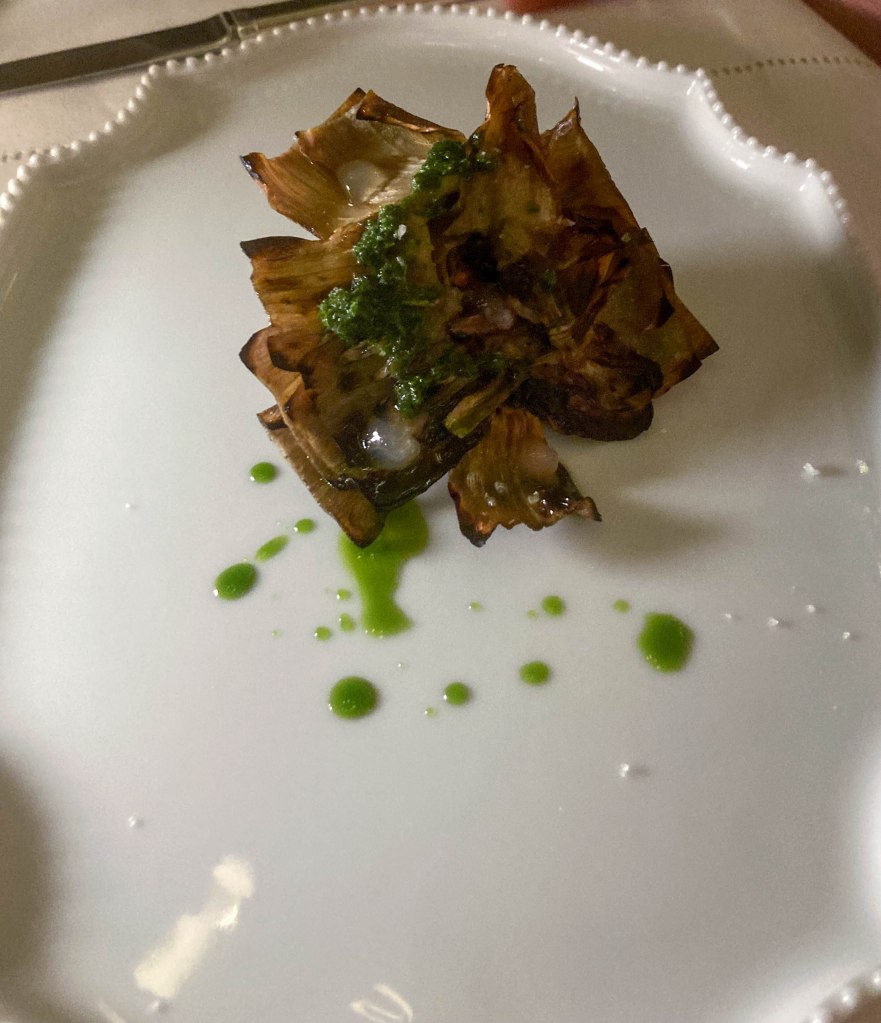 The third course was grilled and roasted artichoke with chimichurri sauce and a herb-infused oil. The artichoke was plated beautifully and the oil splattered around it made the dish look like a piece of art. The artichoke had a smokey smell and flavor, with a rich earthy taste that reminded me of vegetables grilled on a barbecue. The chimichurri was fresh and aromatic, which added another layer of flavor to the dish. Finally, the herb-infused oil on the plate tied the dish together, combining the freshness of the chimichurri, with the earthiness of the artichoke. Overall, this dish was thoroughly thought through and tasted amazing.