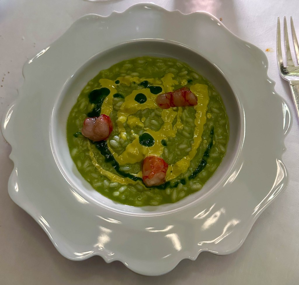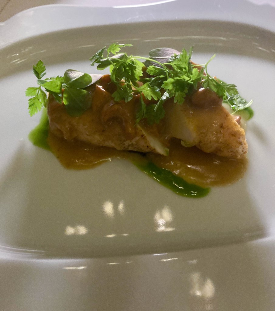 For the fifth course, we were served shrimp risotto with two different green sauces on top. The plating was beautiful and made the dish look like a piece of art. The risotto was soft, but I was glad that the texture of the rice remained. The shrimp had a very pronounced shellfish flavor that I could taste in the risotto, which was delicious. One of the green sauces tasted like the herb oil that was used in many of the prior dishes. The oil added an earthy flavor to the dish, as well as elevating the other flavors around it. The other green sauce tasted earthy as well, with hints of pepper, mint, and spinach. Overall this dish combined many different flavors to create an amazing course.