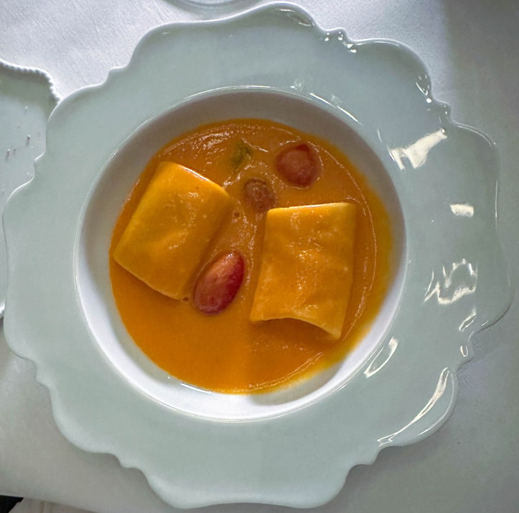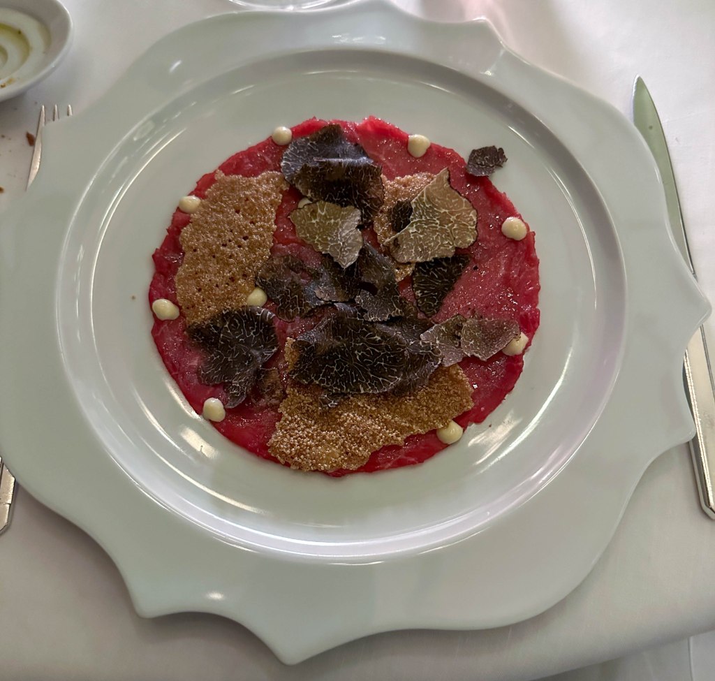 Il Carpaccio is a Michelin one-star restaurant nestled in the heart of Paris, France. Il Carpaccio is in a prime location, sitting only a couple blocks from the famous Arc De Triomphe. Head chefs Oliver Piras and Alessandra Del Favero joined Il Carpaccio in 2021 and helped them earn a Michelin star for their exquisite Italian cuisine. The restaurant is located inside the very upscale Le Royale Monceau hotel. When we walking in, the restaurant was sparsely lit, giving it a very eerie but also formal vibe. I noticed that the decor was very Italian, with silky white tablecloth, and beautifully plush chairs. The air had a slight truffle aroma wafting through the room, which expedited our excitement for the meal ahead.